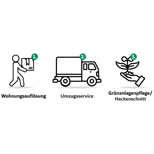 Gerne organisieren wir mit unseren Partnern Wohnungsauflösung, Umzugsservice und Grünanlagenpflege / Heckenschnitt.